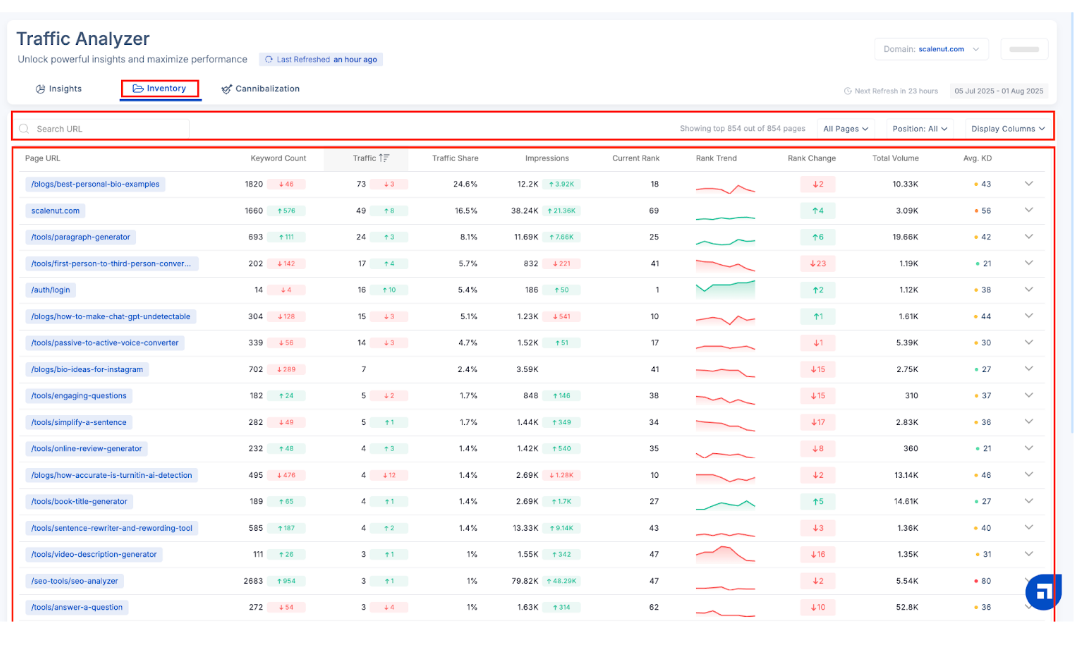 Close the expanded view to go to the main Inventory screen. Then, switch between Traffic, Traffic Share, Impressions, Current Rank, Rank Trend, Rank Change Total Volume, and average KD to view their respective data. In this case, we are looking at the ‘Traffic’ data. Click on your desired term to view results for it. You can also expand, like in the case of the Keyword Count.
