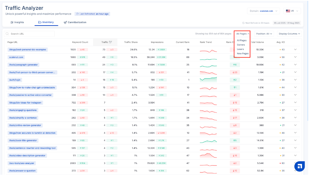 You can view the data for All Pages (default view) or choose among Top Gainers, Losers, and New Pages. All you need to do is click the down arrow and choose your preference.