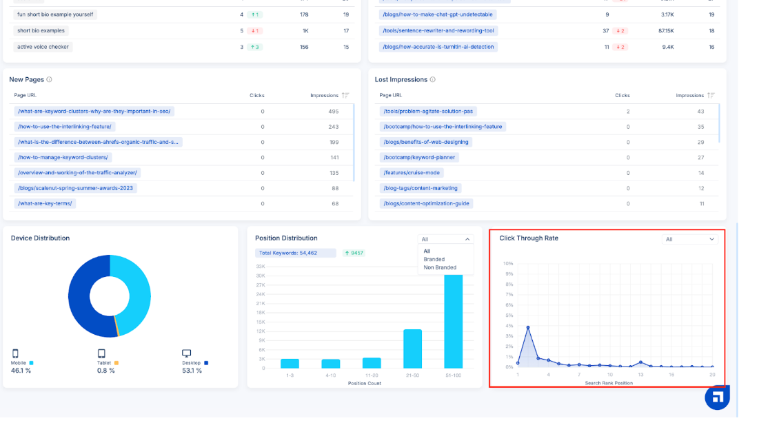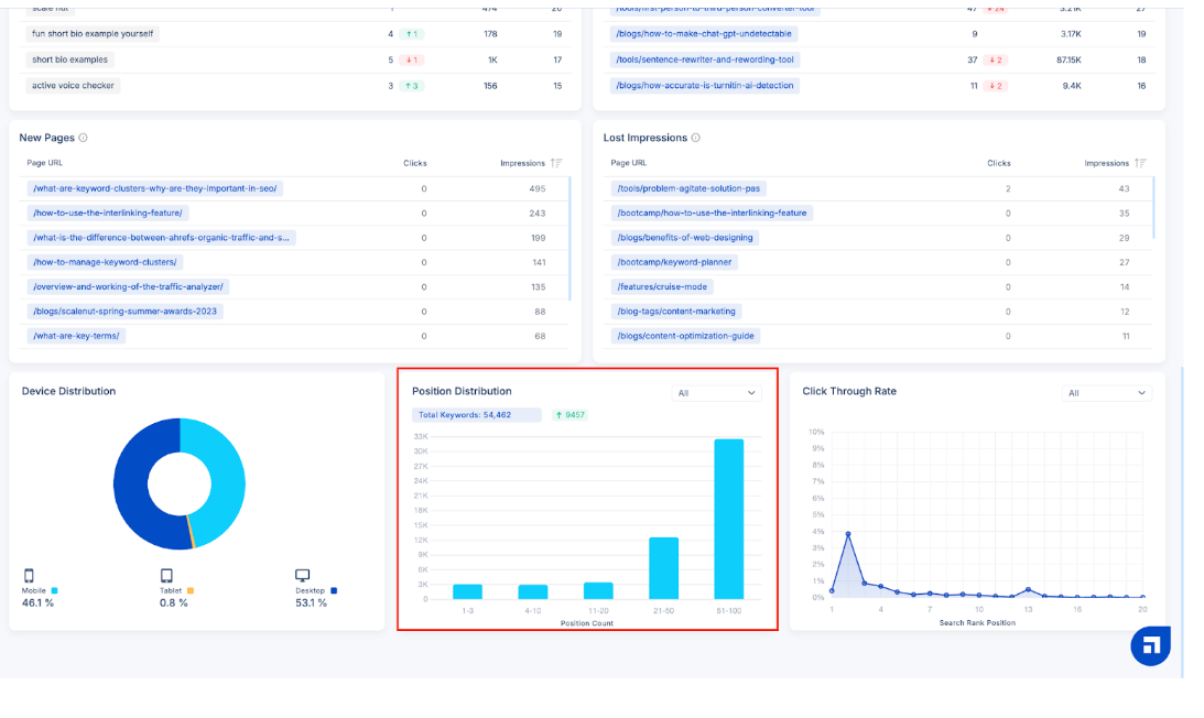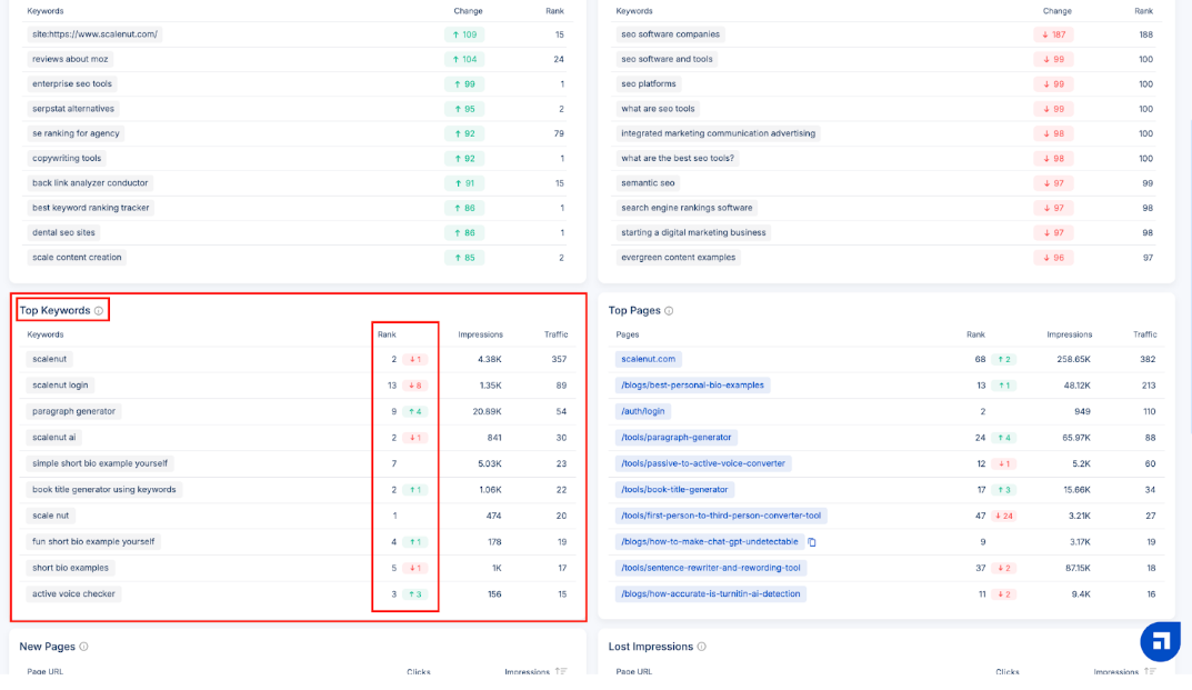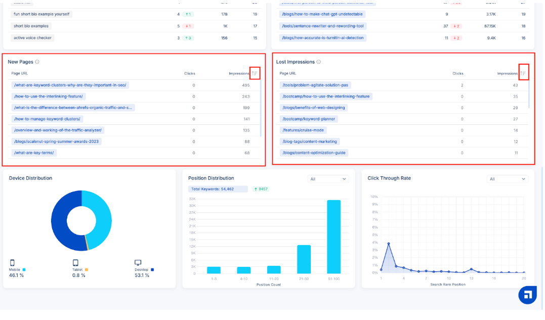 New Pages are web pages previously absent from search engine rankings but have now gained visibility. In contrast, Lost Impressions are web pages that received impressions in the last to last month but have had no engagement within the past month.