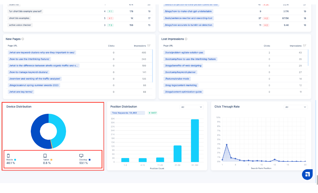 Next, comes the Position Distribution. It shows when a keyword appears in different search engine result pages, such as top 3, 4-10, and beyond. You can also view the change in movement of the keywords and the total keyword number.