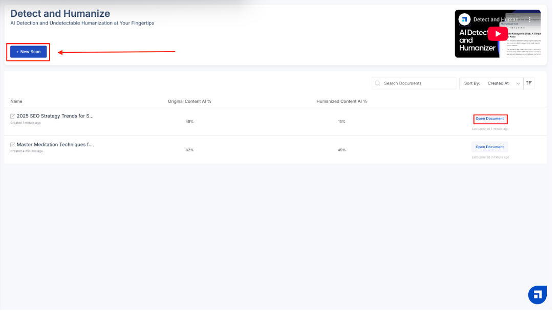 You’d then be redirected to the ‘Detect and Humanize’ section. To check for any new content, click on ‘New Scan’. In case you want to work on a content which you’ve already checked before, simply click on ‘Open Document’ available beside the name.