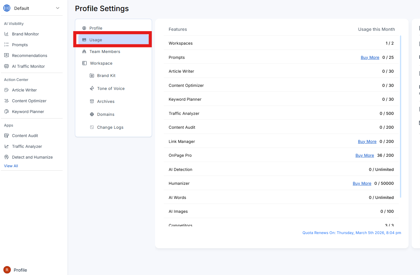 Tip: Monitoring usage for all the tools ensures you never run out of limits unexpectedly and can make the most of your plan benefits.