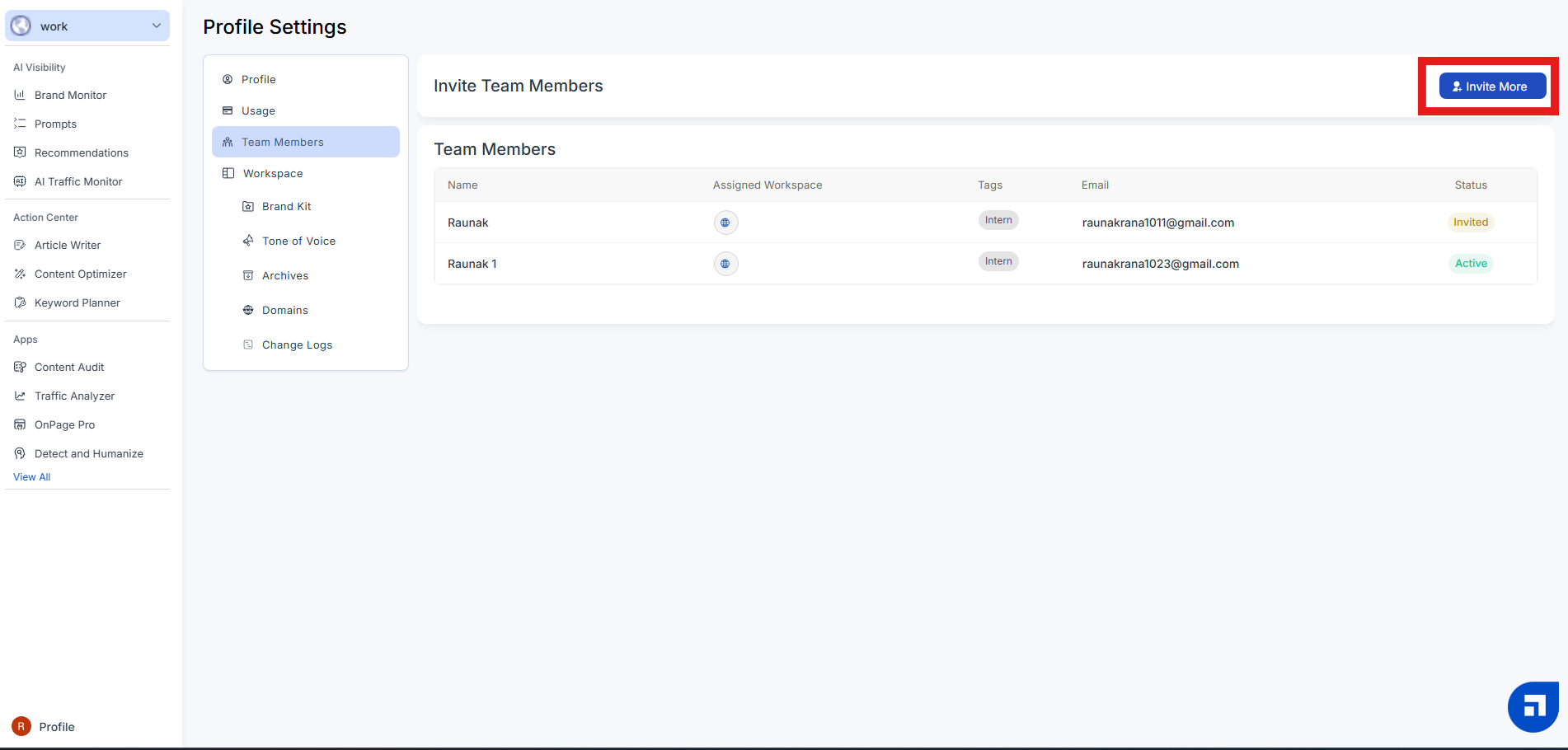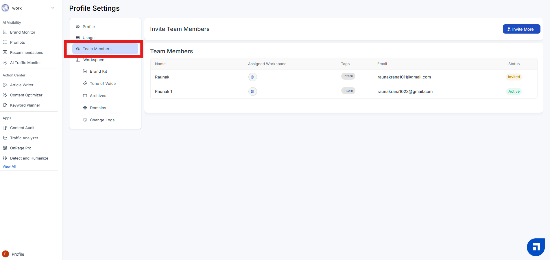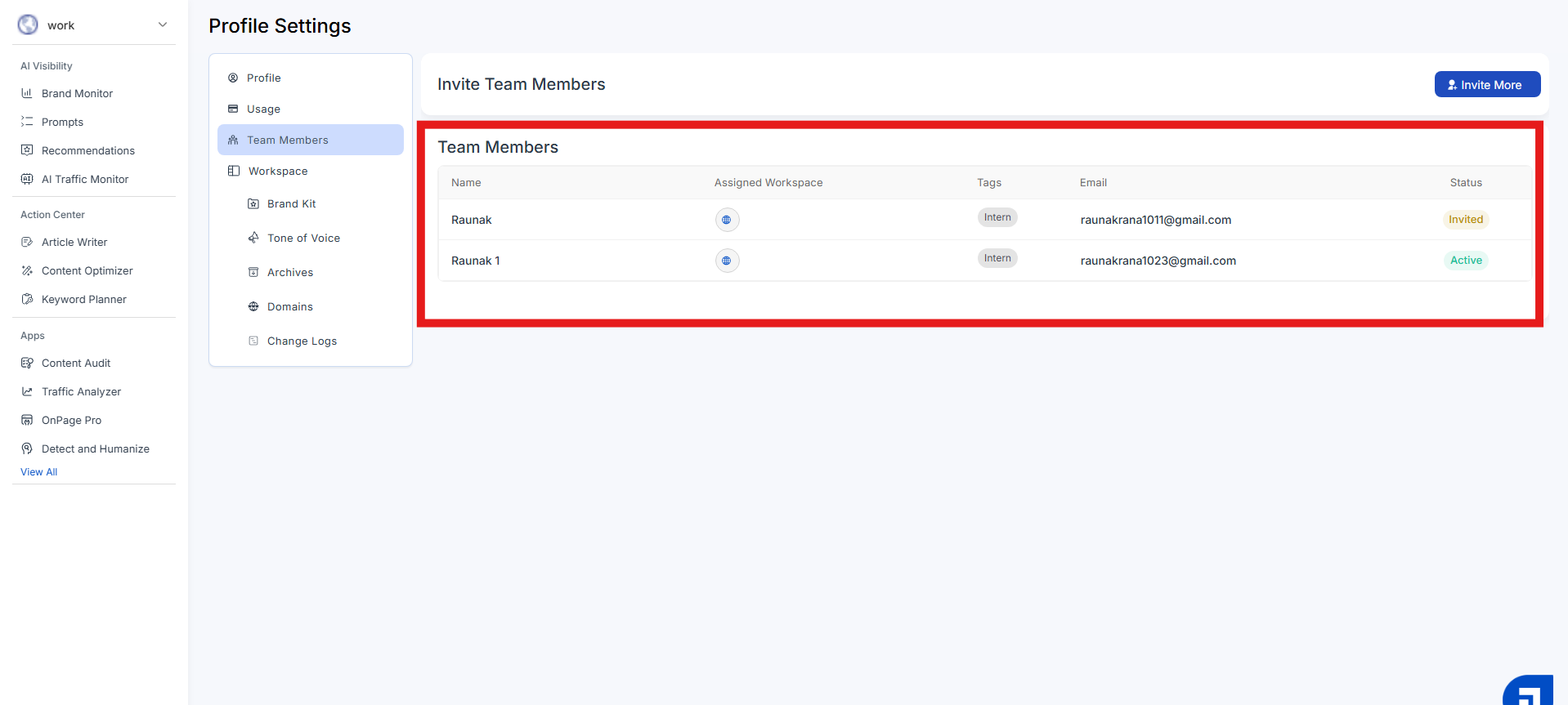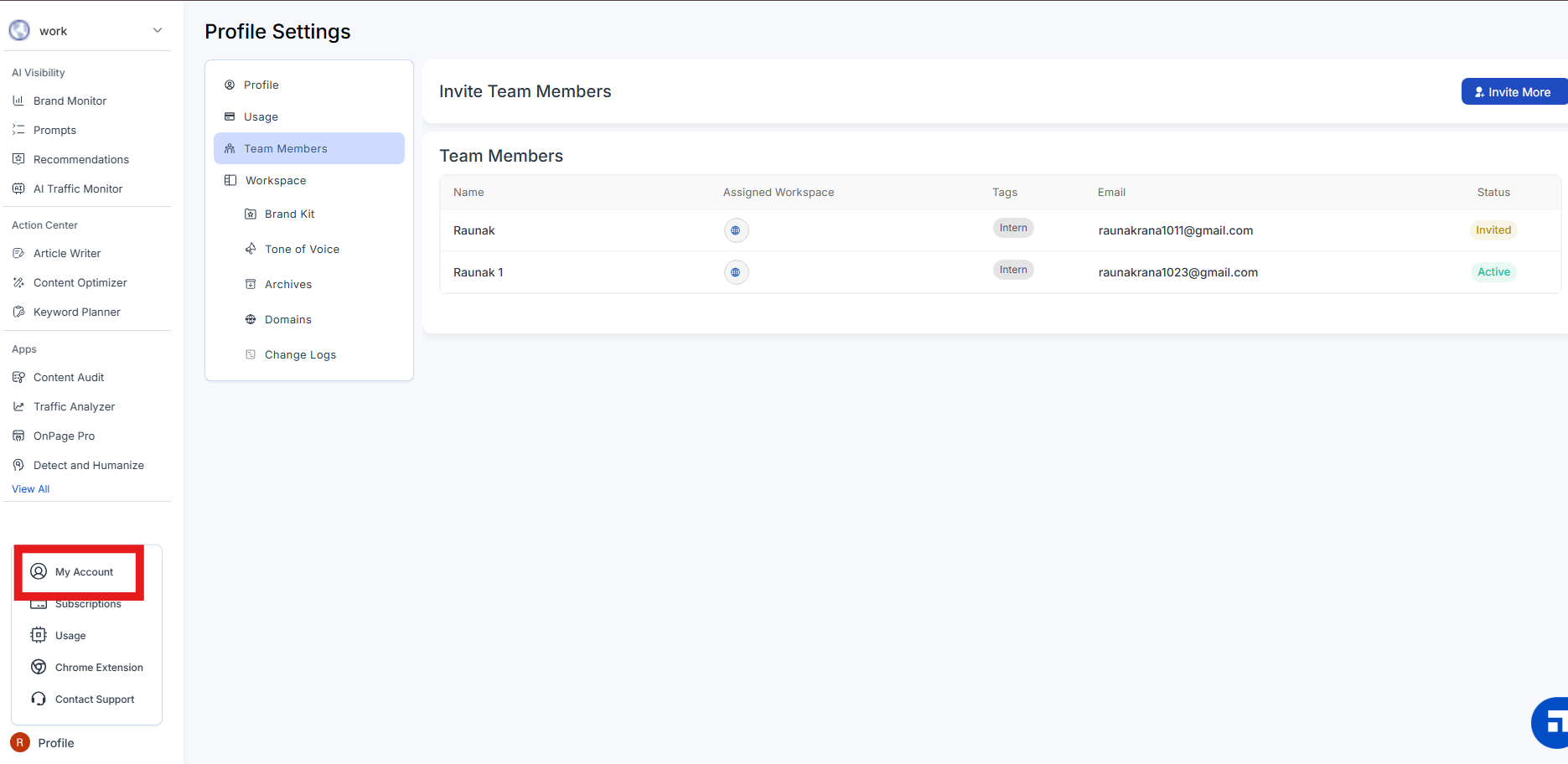 Now, head over to the ‘Domains’ section under ‘My Account’ to manage access permissions for each team member across different domains. This allows more granular control over who can view or work on specific domain-level GEO data.