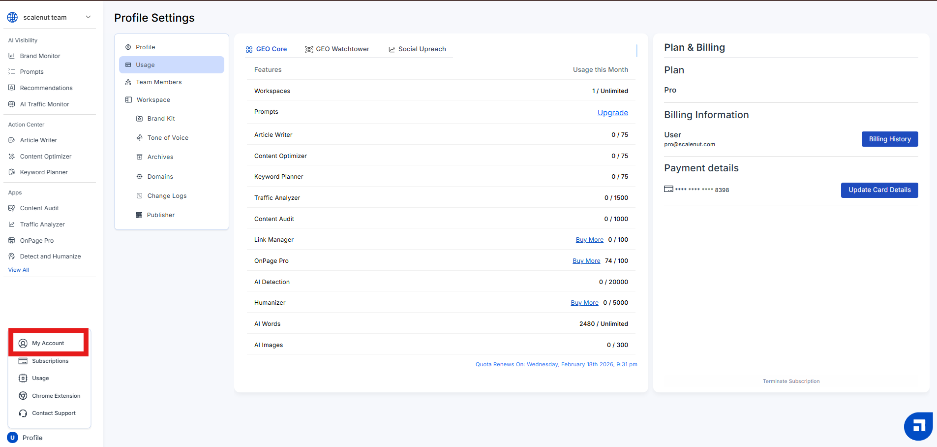 Log in to your Scalenut account with your credentials and head over to the My Account section at the bottom left corner of your screen.
