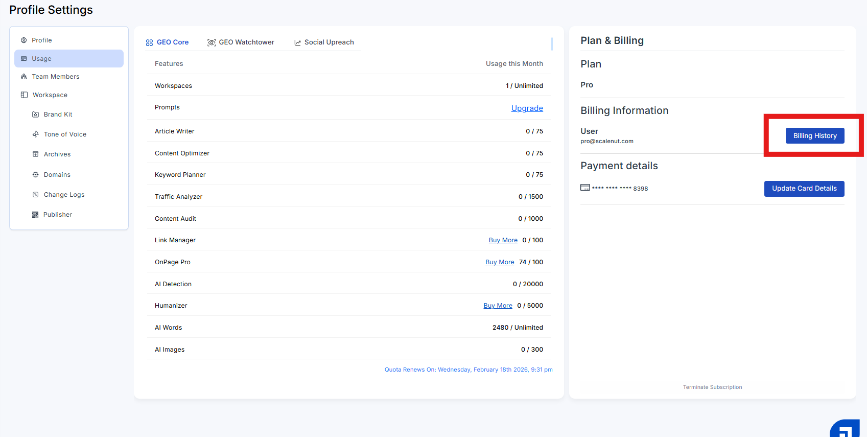 Scalenut makes this process effortless by providing a simple and accessible way to view, download, and manage your billing records right from your dashboard.