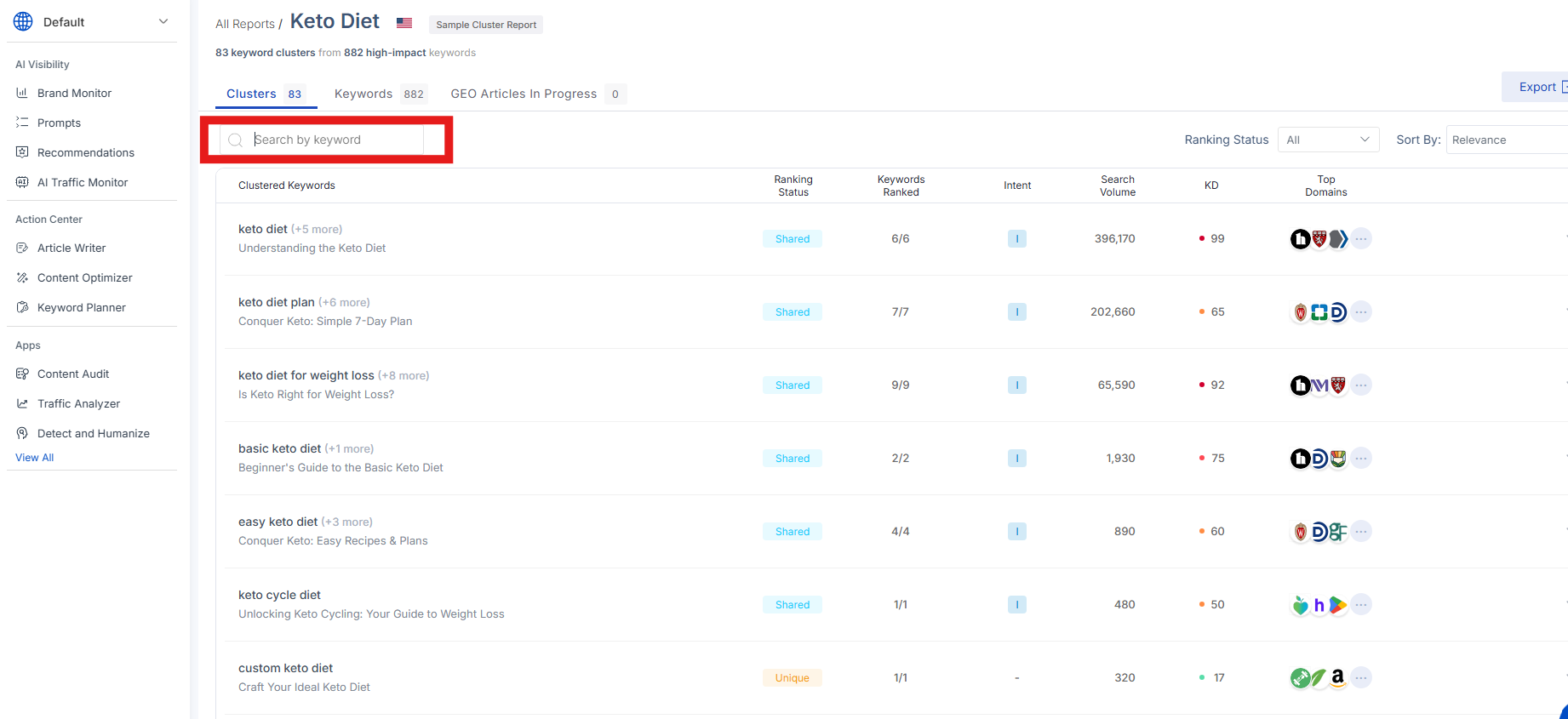 You can search by keywords or sort the list by Relevance, Keywords in Cluster, Keyword Rank, Search Volume, or Keyword Density.