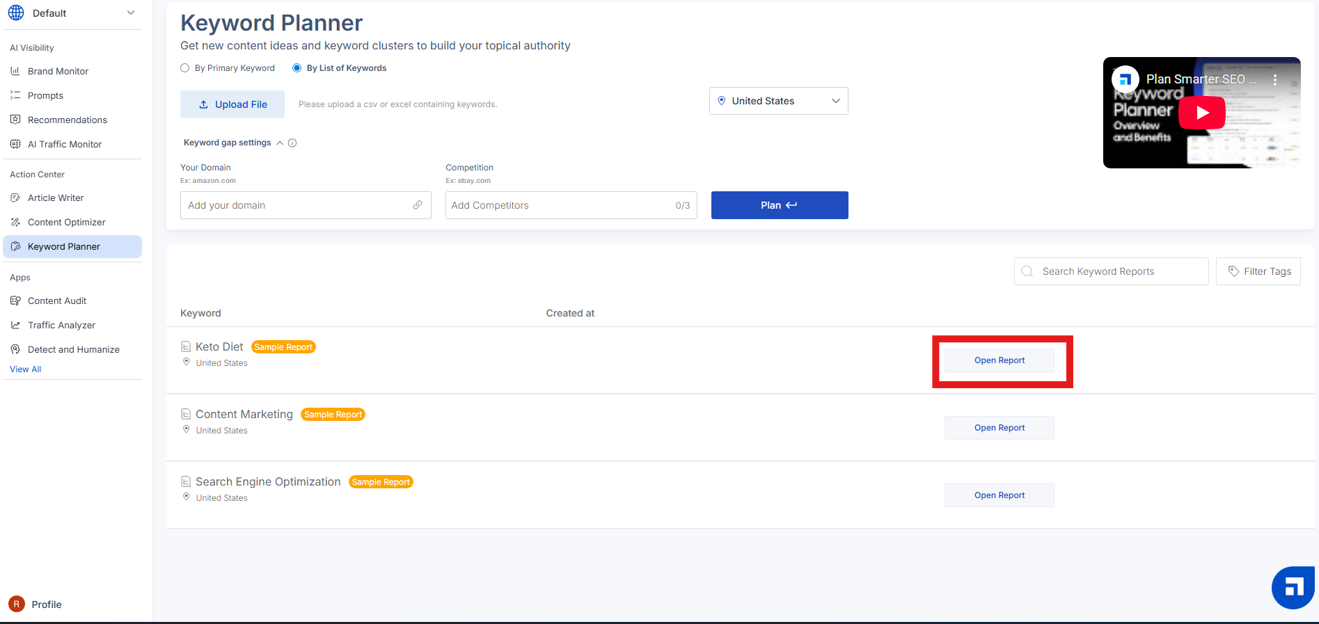 After you get the report for your desired keyword, Click the ‘Open Report’ button to view a detailed report of Keyword clusters.