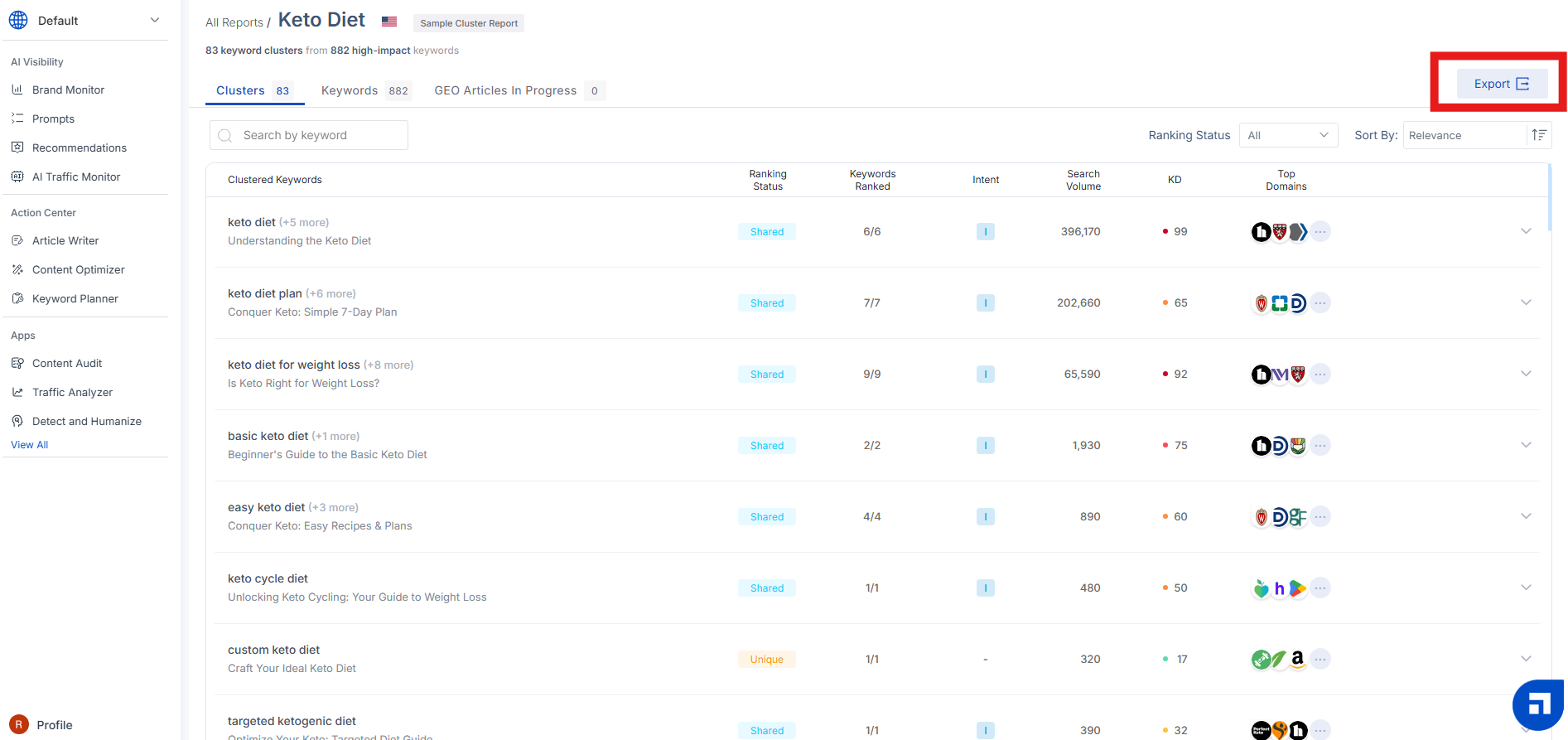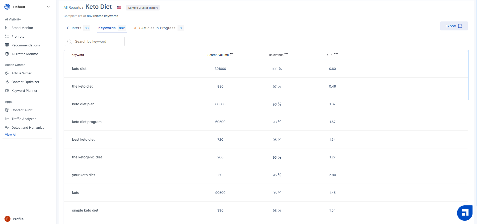 Alternatively, you can also click on ‘Keywords’ to view search volume, relevance and CPC (cost per click) for each keyword. You can also export the cluster and keyword list by clicking on the ‘Export’ option available on your screen.