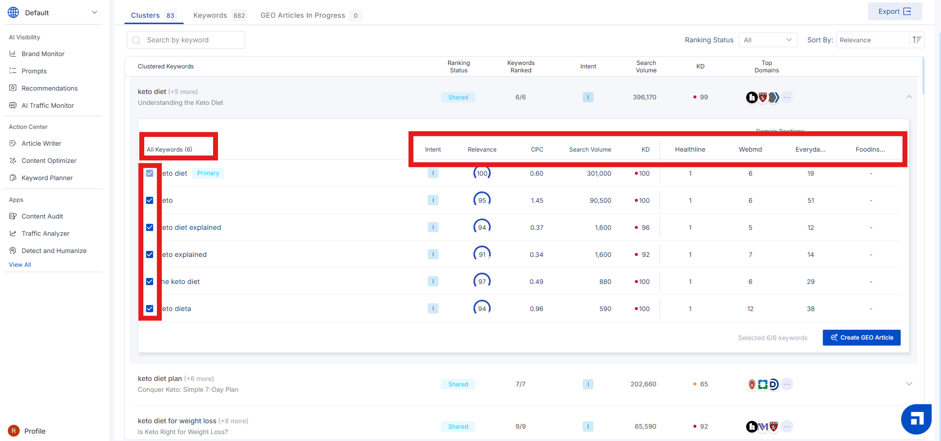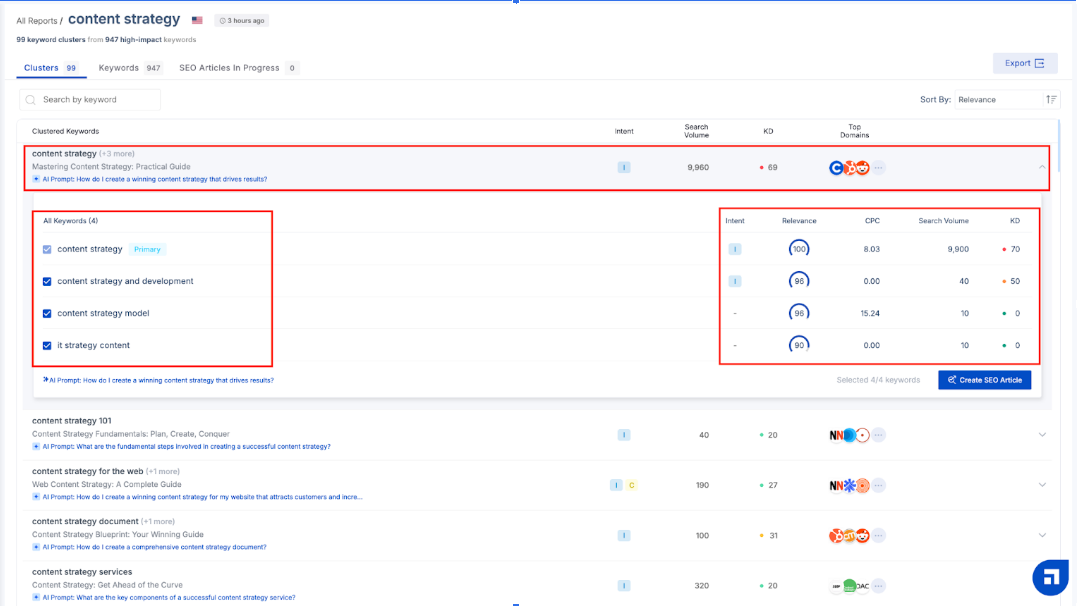 When you click the 'Expand' icon, you can see the list of keywords within a cluster along with details such as the intent, relevance, CPC, search volume and KD. Here, you can select the keywords that you would want an SEO Article for later on. Let’s say you want to expand ‘Content Strategy’ . Here’s all the data that you get.