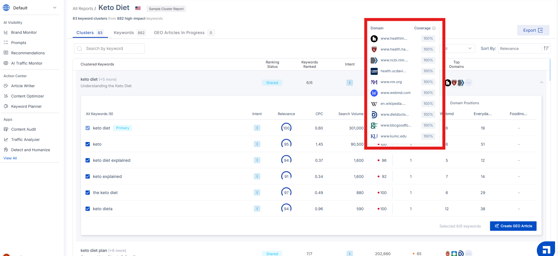 9. Analyze Top Domains (Pro & LTD Only) - See which domains dominate specific clusters, understand their strategy, and find ways to outperform or collaborate.