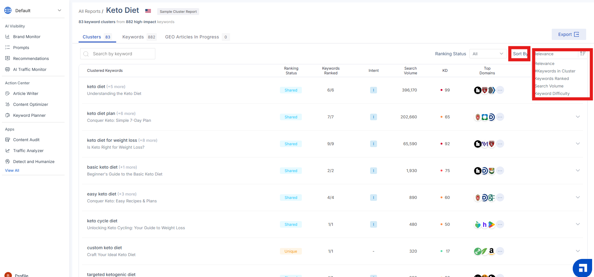 1. Sort By - Use the ‘Sort By’ option to organize your keyword clusters based on key metrics like relevance, keywords in cluster, keywords ranked, search volume, and keyword difficulty. Additionally, you can sort them by ranking status—such as All, Shared, Unique, Missing, or Untapped.