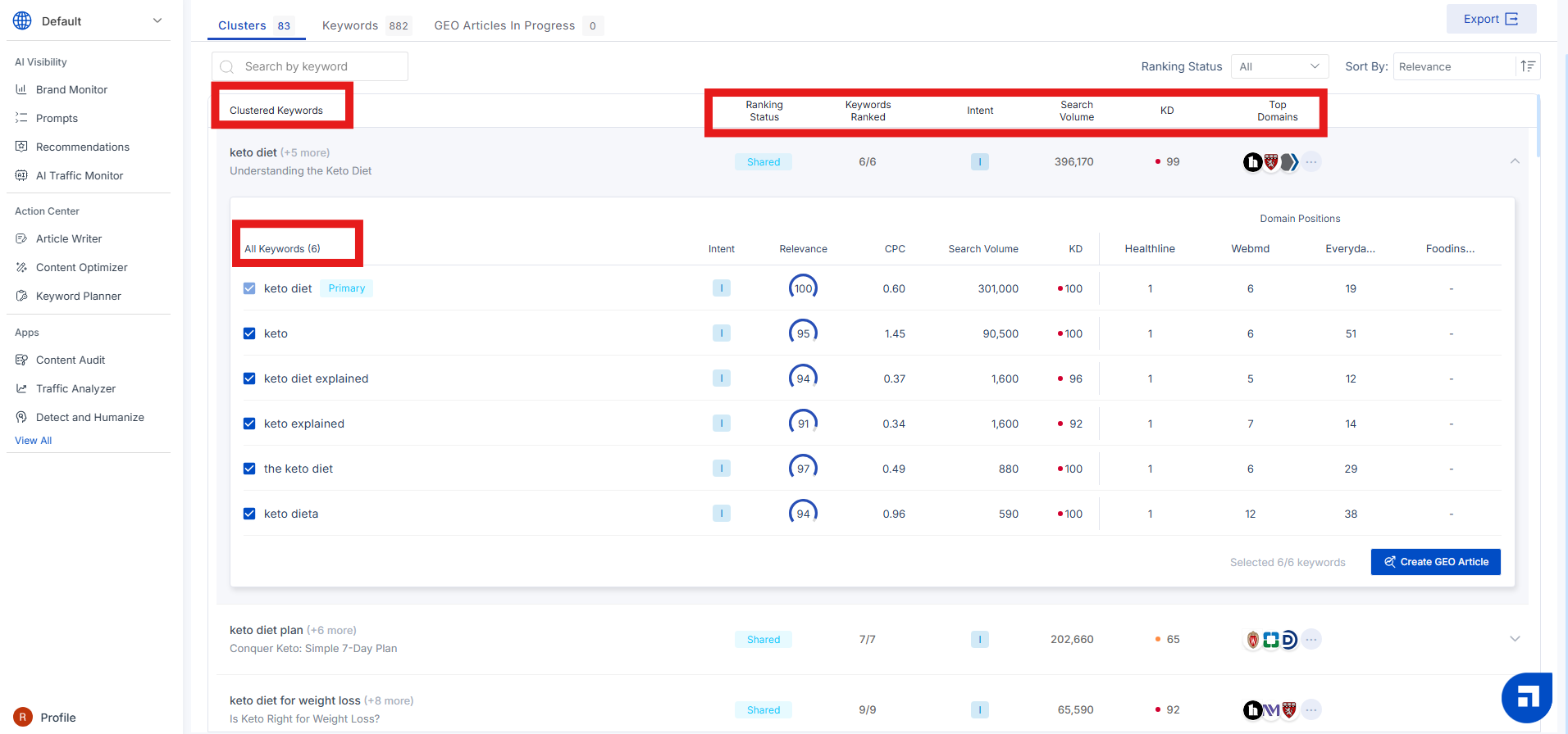 These clusters are organized into tabs, including Clustered Keywords, Ranking status, Keyword ranked, Intent, Search Volume, Keyword Density, and Top Domains. You can easily explore each tab to dig deeper into your keywords.