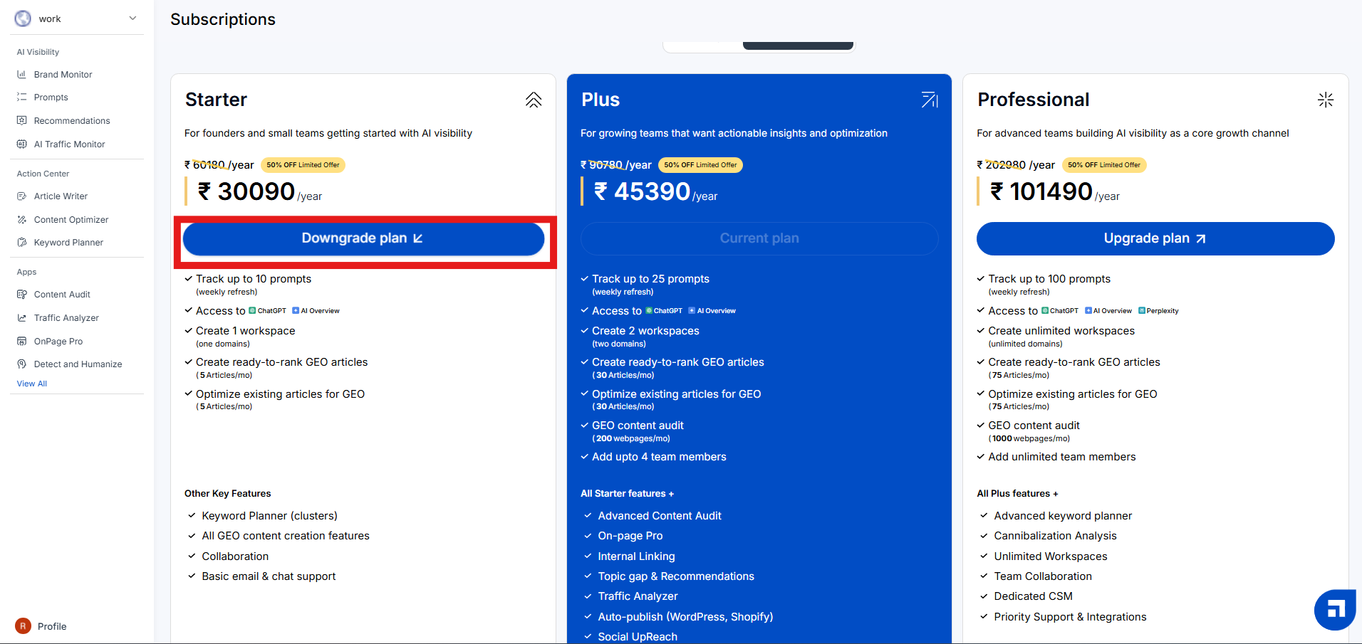 For example, Plus users can switch to the Starter plan, or Professional users can shift to the Plus or Starter plan.
