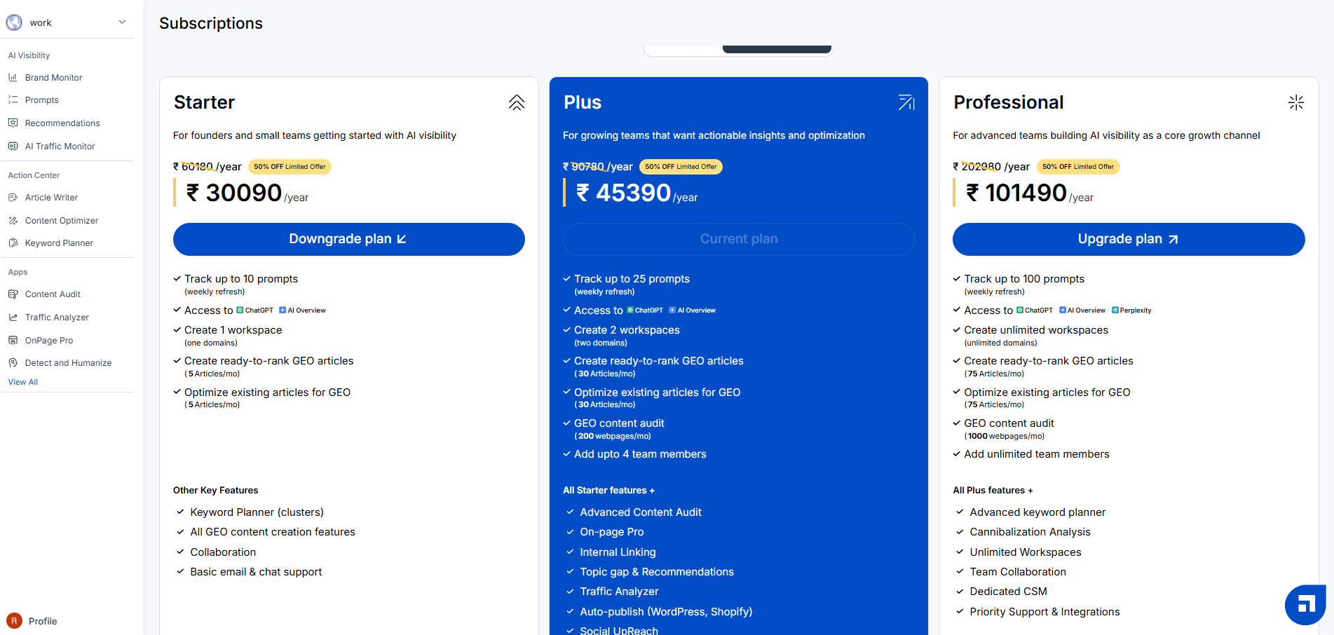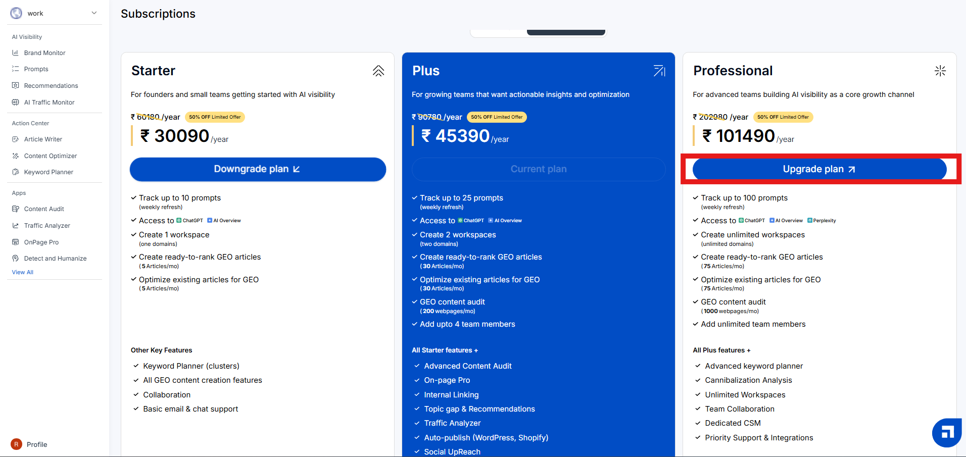 Click on the Upgrade Plan button related to the plan you wish to upgrade. For example, if you are a Starter plan user, you can upgrade to the Plus or the Professional plan. Similarly, Plus plan users can upgrade to the Professional plan by clicking on the Upgrade Plan option in blue.