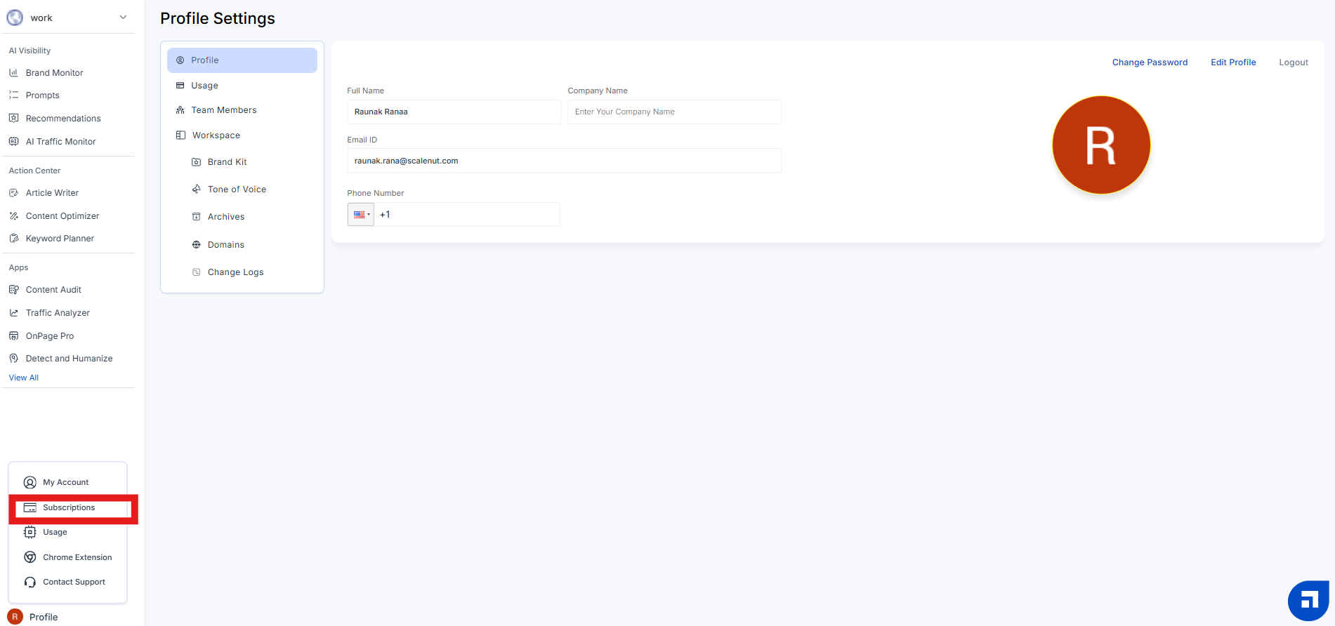 Log into your Scalenut account, hover over the Profile tab, and click on the Subscriptions option.