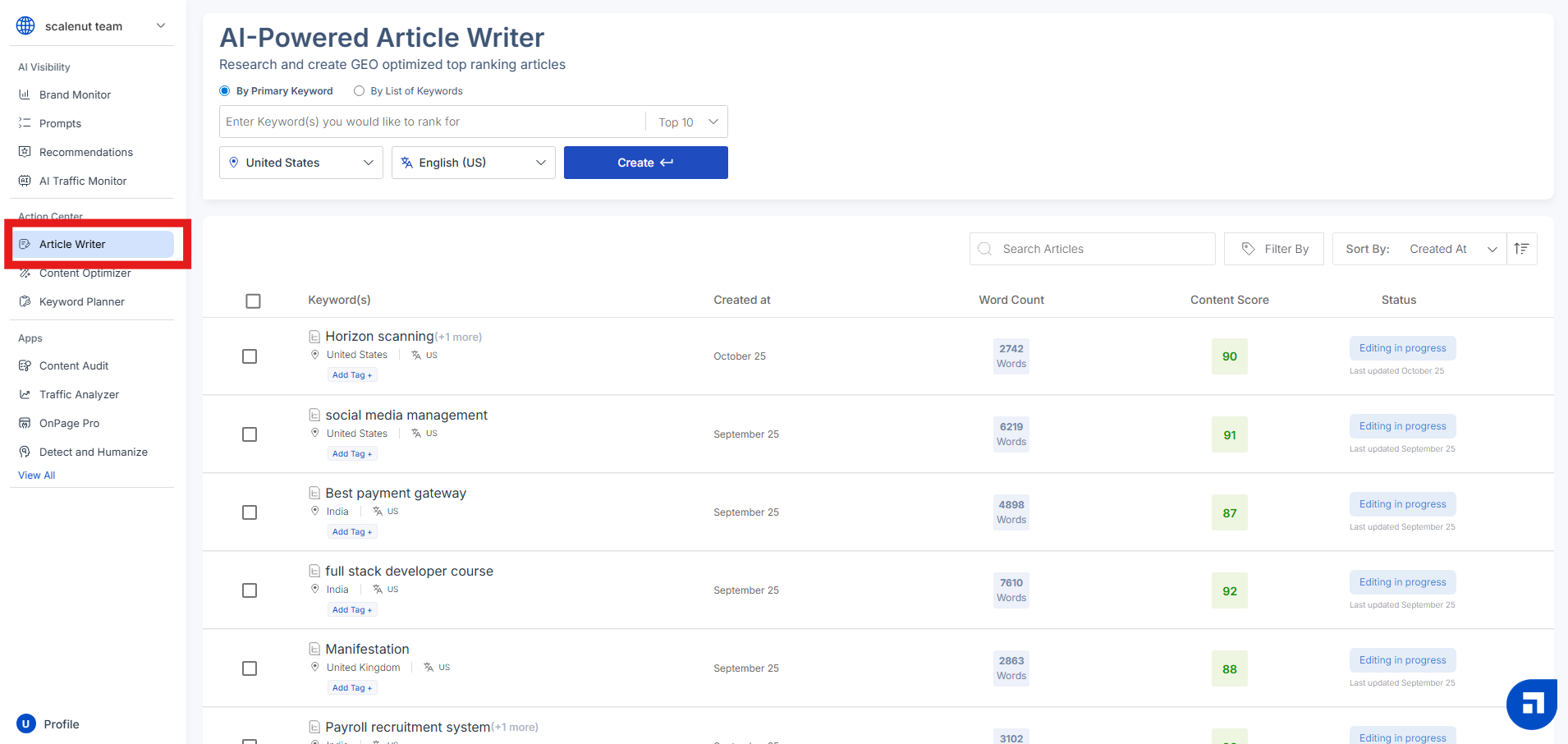 Navigate to your Scalenut Dashboard and click on the "Article Writer" option under Action Center.