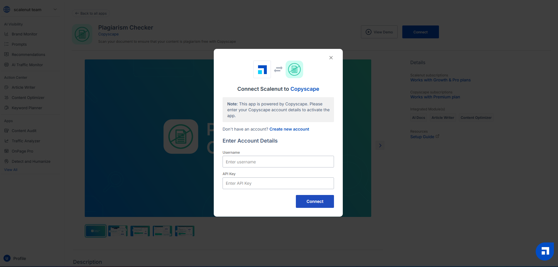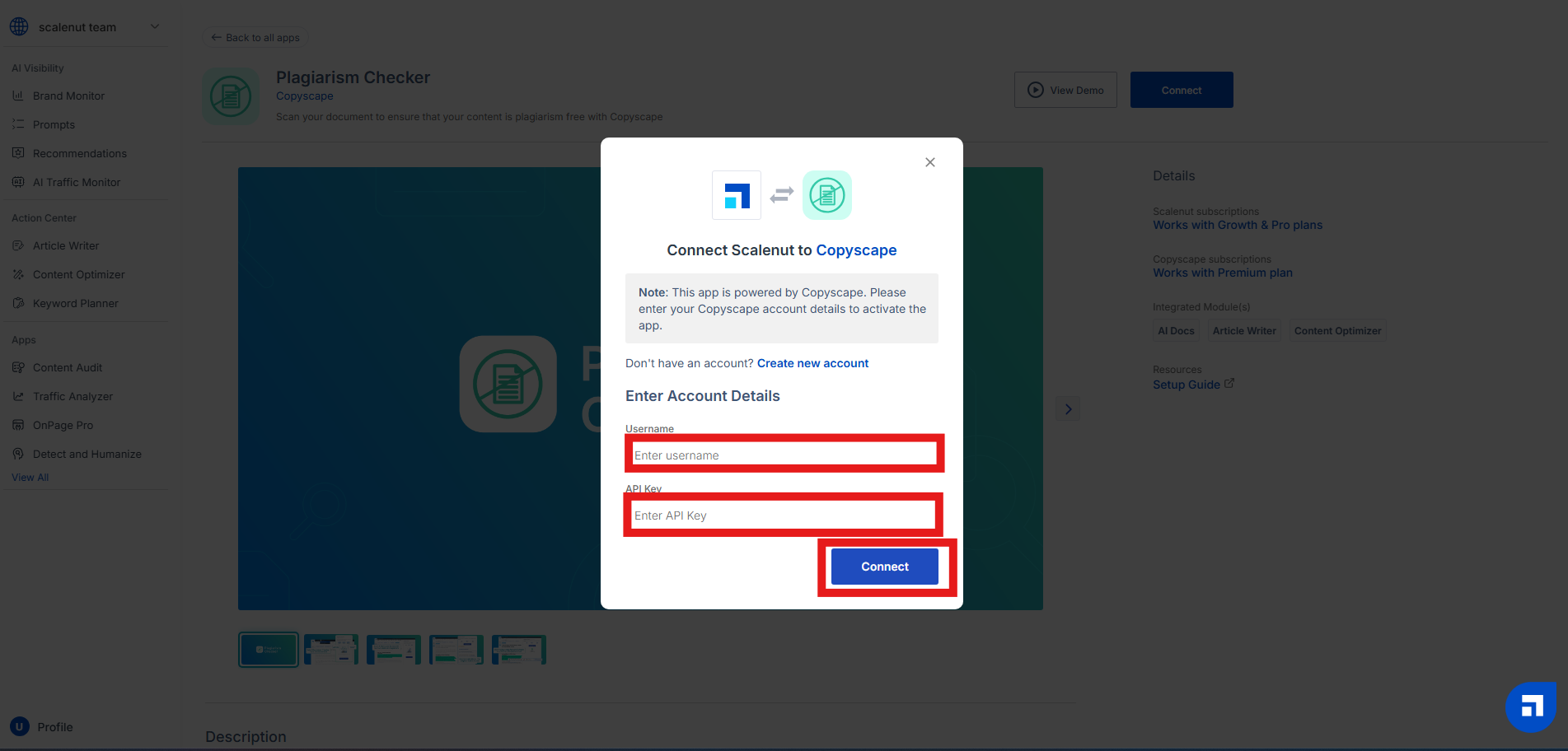 Enter your Username and API key. Then, click on ‘Connect’ to link your Copyscape account with Scalenut.