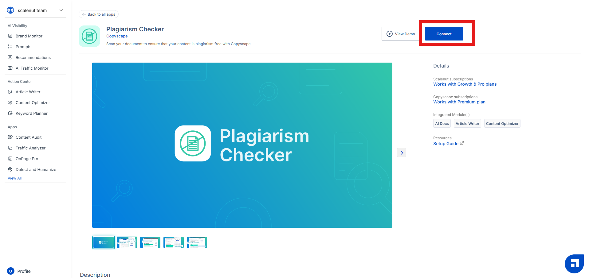Follow the step-by-step instructions below to connect and utilize the Plagiarism Checker plugin with your Copyscape account within the Scalenut content suite.