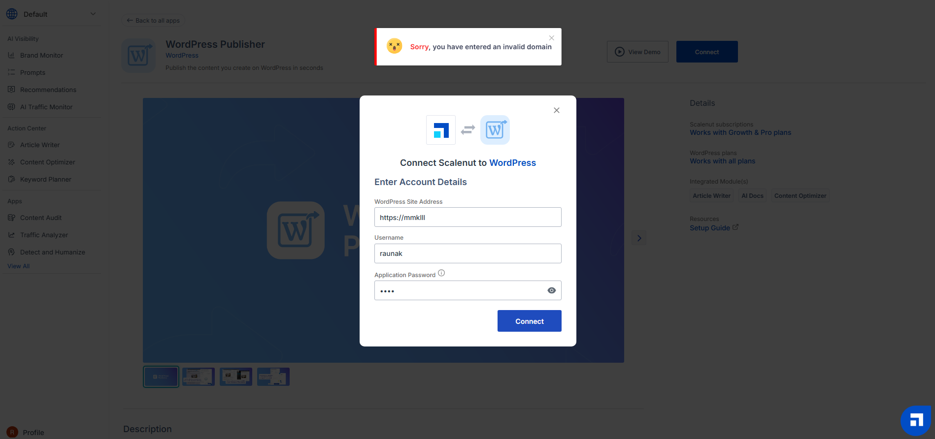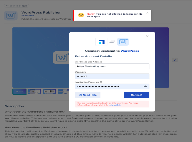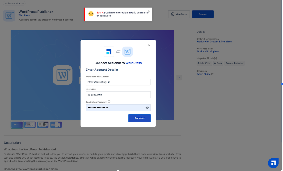 Please follow the process given in this article (https://help.scalenut.com/wordpress-x-scalenut-how-to-publish-an-article-on-wordpress-from-scalenut/ ) to generate a valid application password and try connecting again.