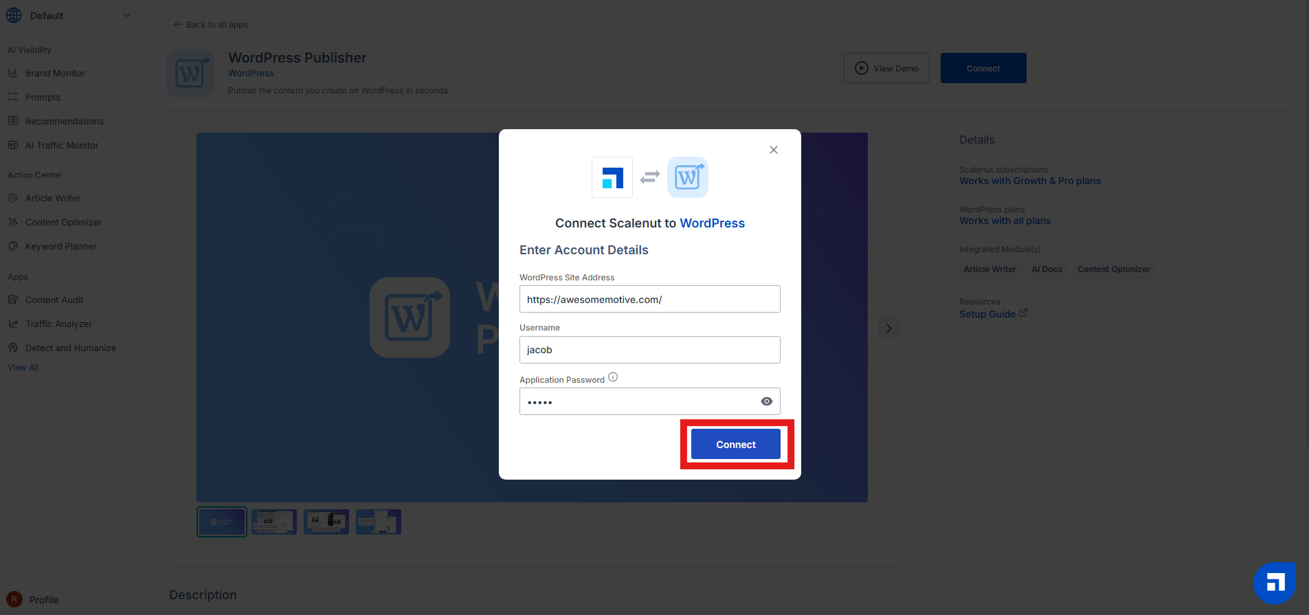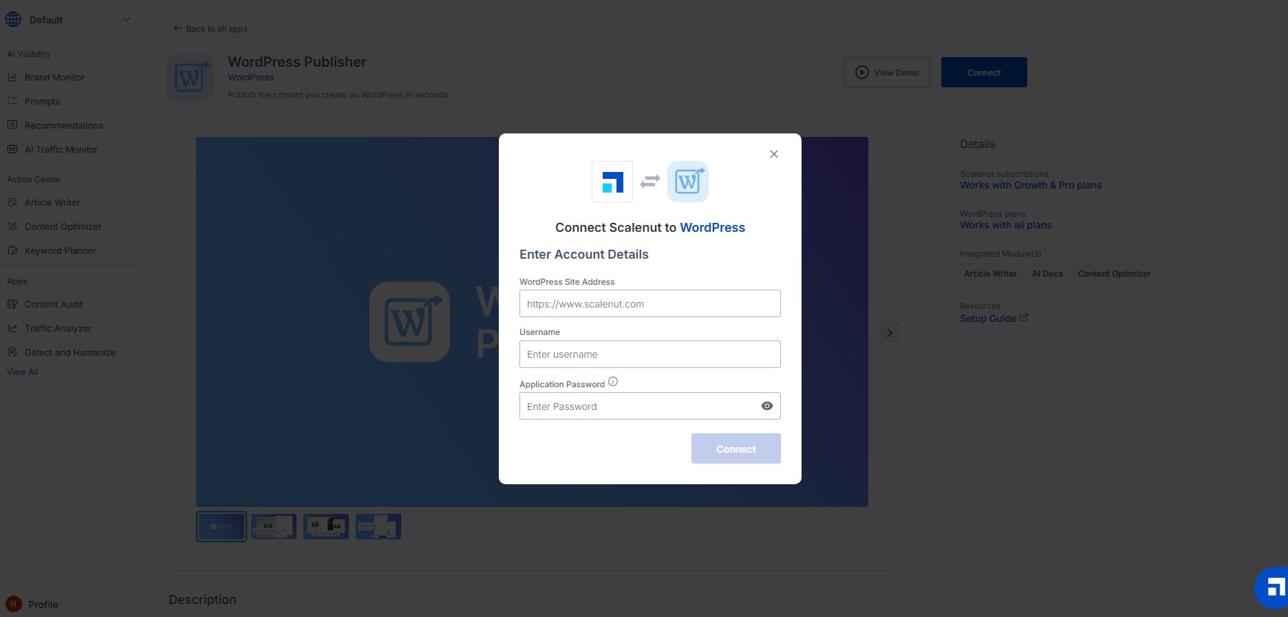 Enter the WordPress Site Address, Username, and the unique 24-character password. Then, click on ‘Connect’ to link your WordPress account with Scalenut.