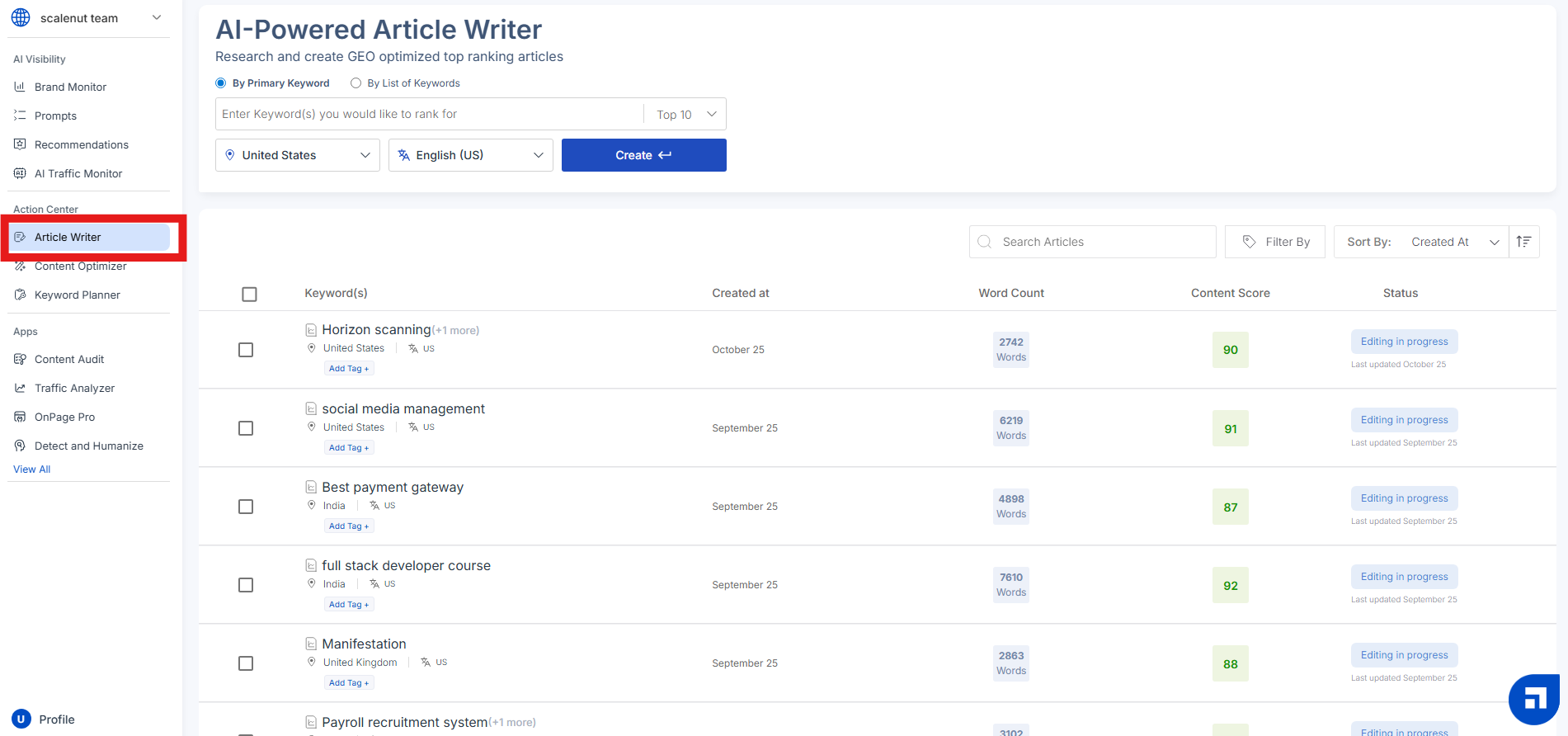 Navigate to your Scalenut Dashboard and click on the "Article Writer" under the Action Center.